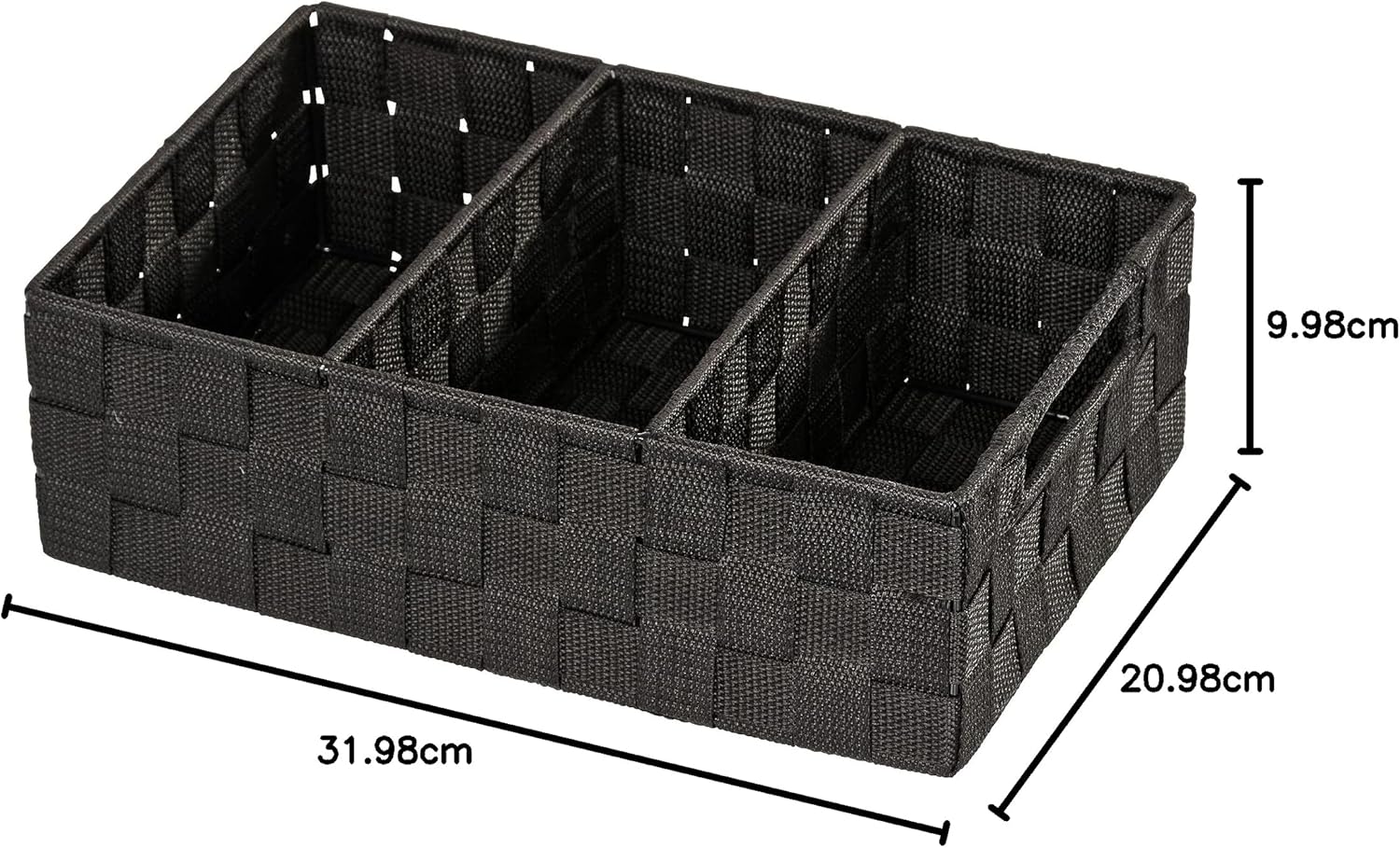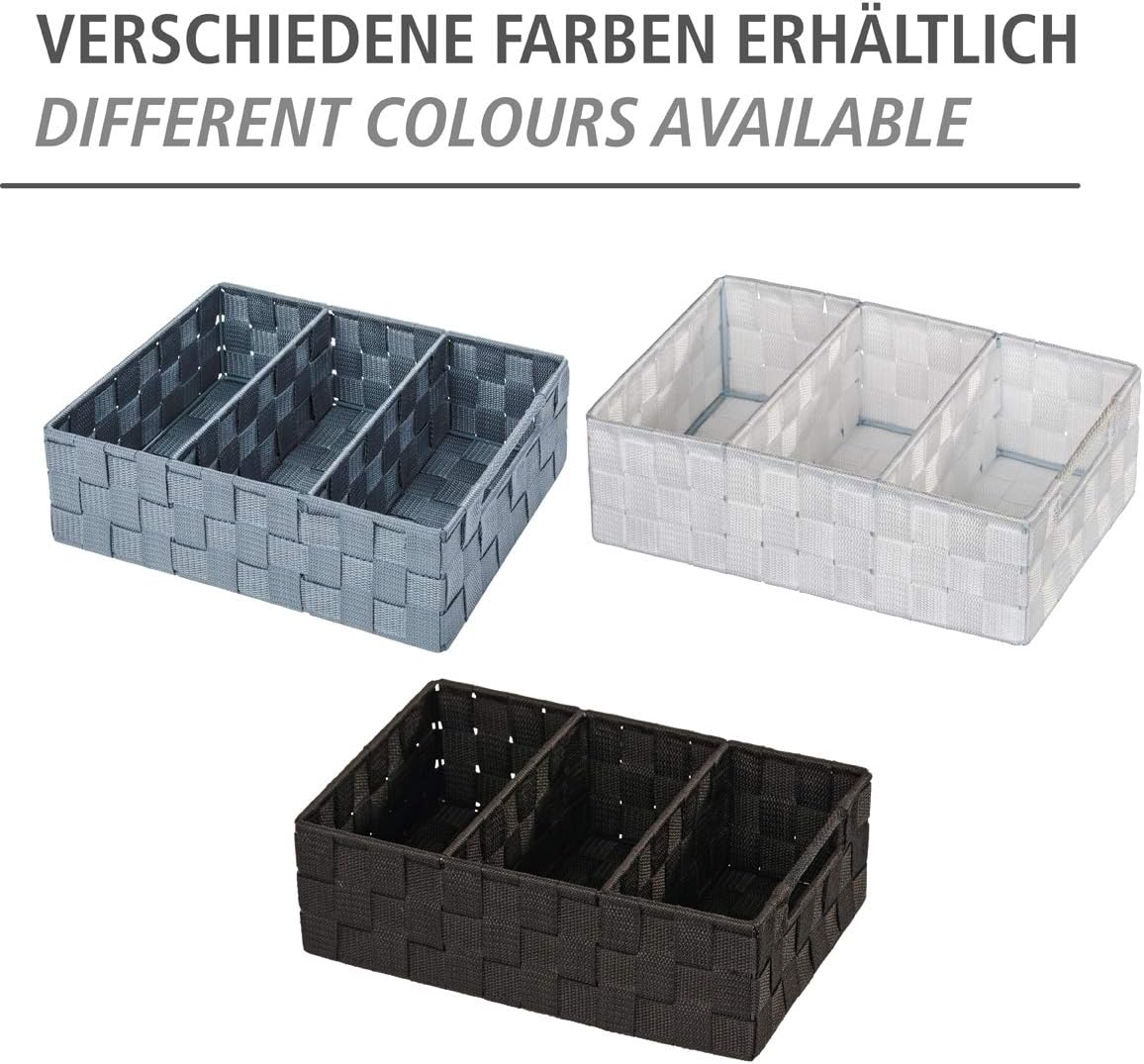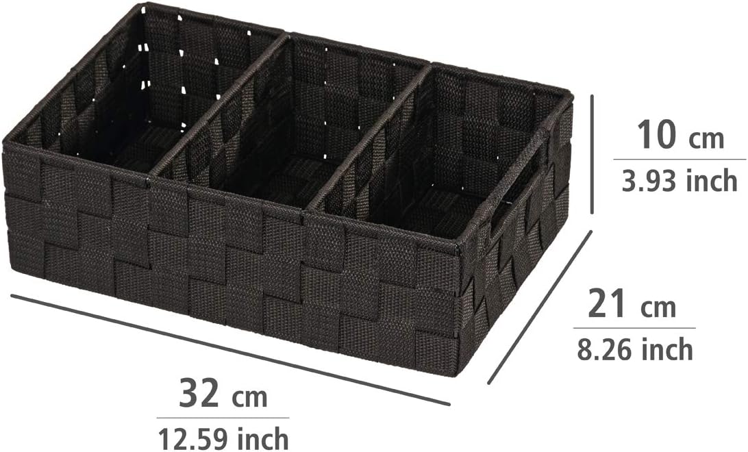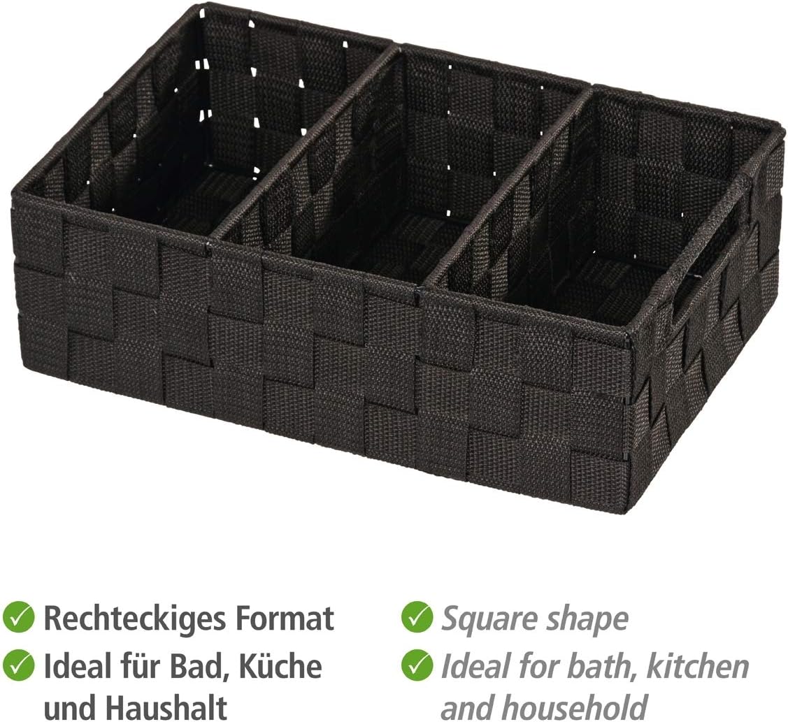Avis et témoignages clients sur : WENKO Organiseur de Salle De Bain Adria avec Poignés, Boîte De Rangement avec 3 Compartiments, Plastique Tissé, en Polypropylène, Dimensions : 32 x 10 x 21 cm, Couleur : Noir