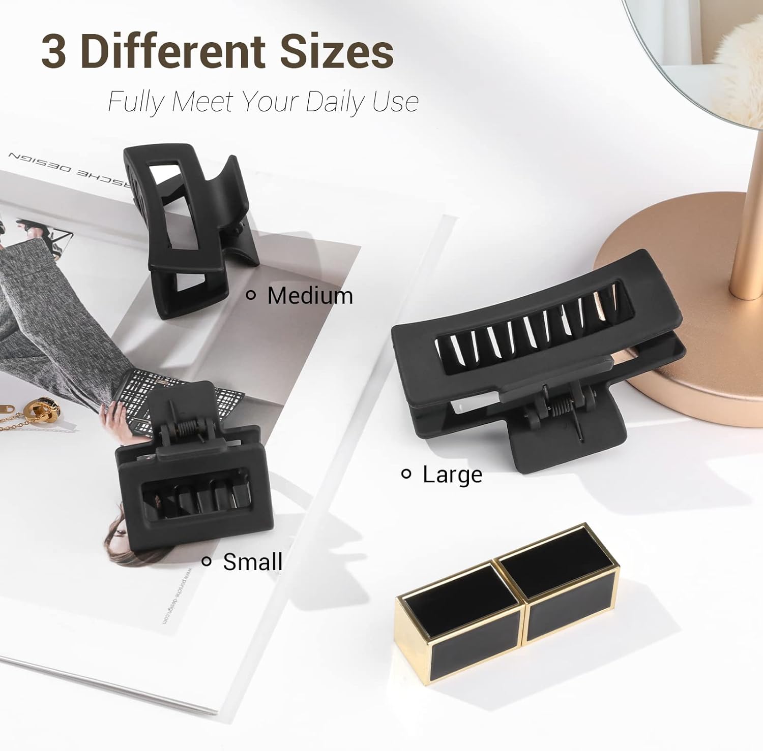 Le lot comprend trois tailles de pinces : grande, moyenne et petite, idéales pour s’adapter à tous les volumes de cheveux. Que ce soit pour une coiffure élégante lors d’un événement spécial ou un style décontracté au quotidien, ces pinces sont votre allié :